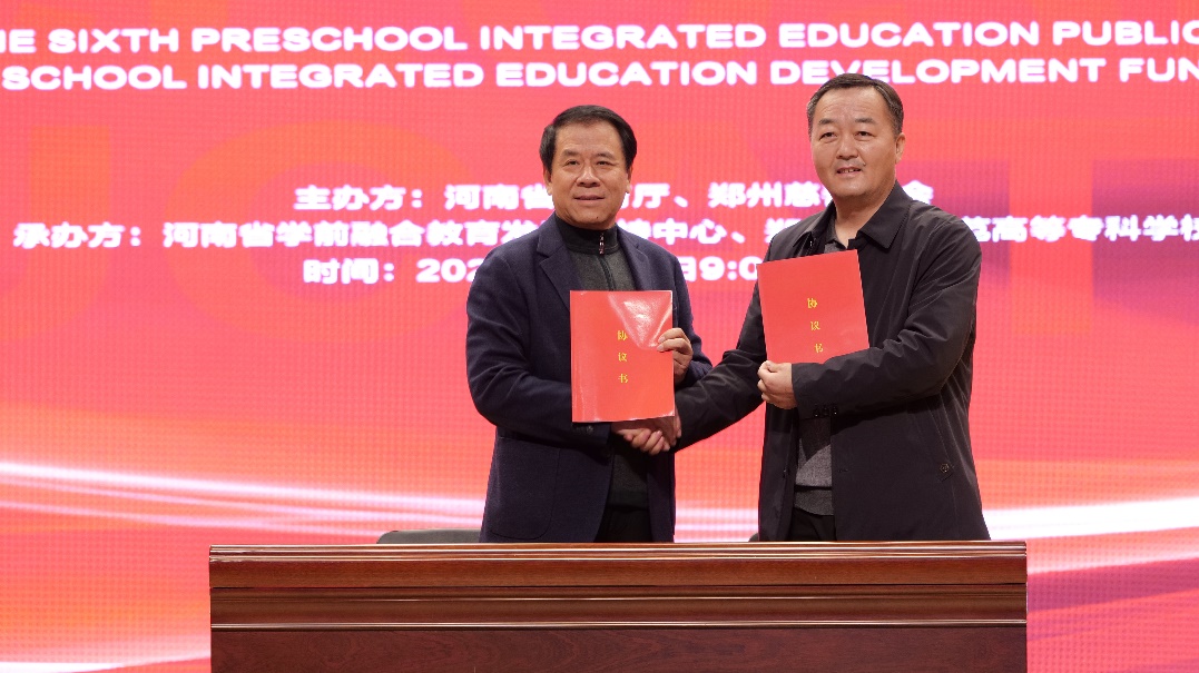 郑州慈善总会•郑州幼专学前融合教育发展基金成立仪式上,郑州幼专校长杨俊良代表学校及爱心企业向郑州慈善总会捐款50万元,郑州慈善总会会长姚待献接受捐赠;随后,与会领导共同为“河南省学前融合教育发展支持中心慈善志愿者工作站”揭牌;最后,郑州慈善总会副会长王万民与郑州幼专副校长张元奎作为代表签订了合作协议,“郑州慈善总会•郑州幼专学前融合教育发展基金”正式成立。