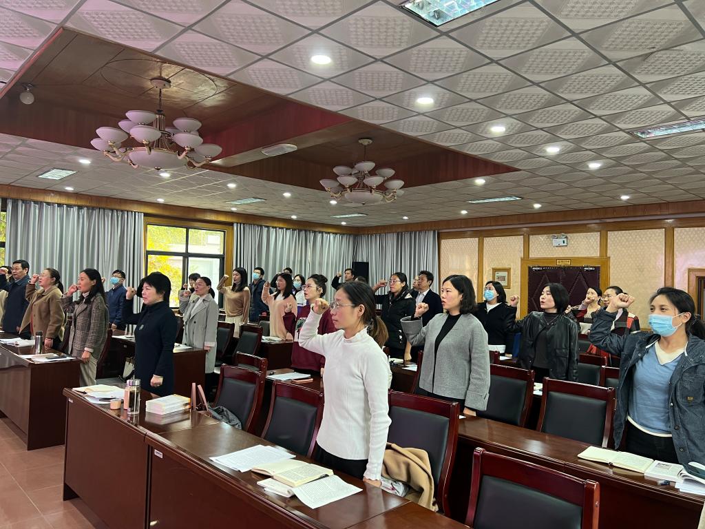 会议开始前,全体党员一起重温入党誓词。鲜红的党旗擎起一颗颗赤诚的心,醒目的誓词凝聚起不忘初心的信念与力量。学生党支部党员高翔领誓,支部全体党员举起右拳,在党旗下接受心灵的净化和洗礼,重温入党时的决心和理想。大家用饱满的热情、昂扬的斗志表达出作为共产党员的自豪感与使命感,抒发对党忠诚的意志和信念。