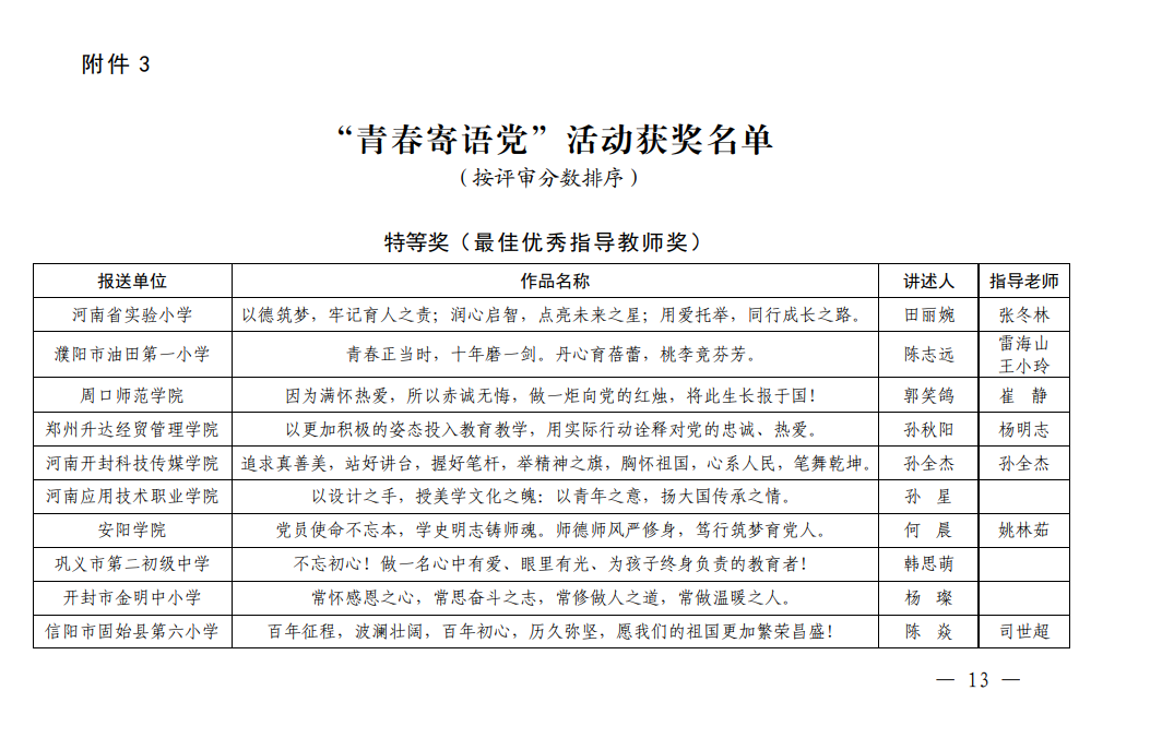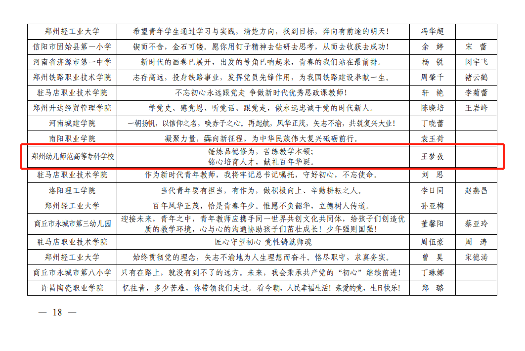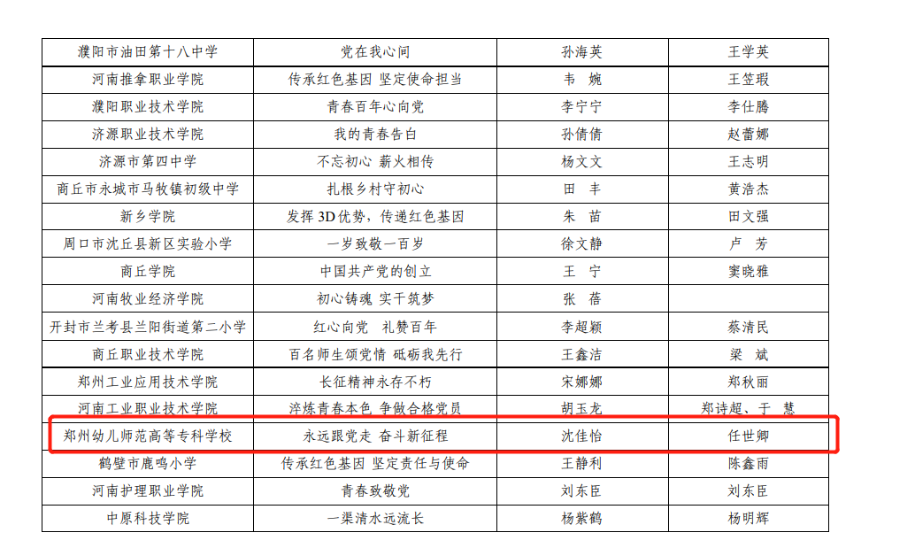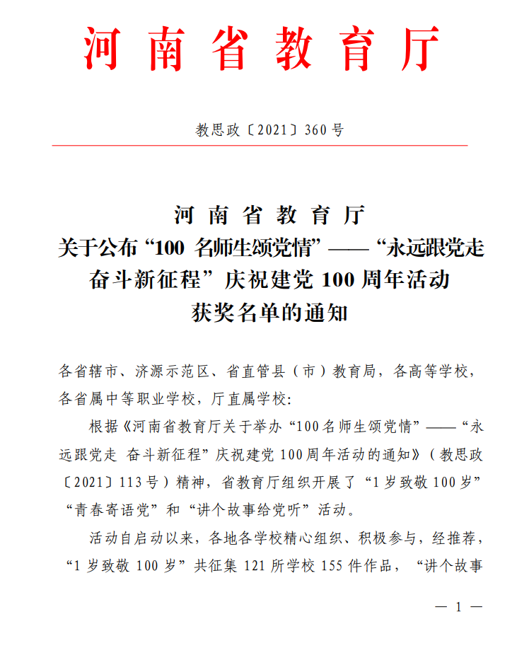 10月9日,河南省教育厅“100名师生颂党情”——“永远跟党走 奋斗新征程”庆祝建党100周年活动获奖名单公布,beat365教师钟明亮、王梦孜以及学生沈佳怡的作品喜获佳绩。