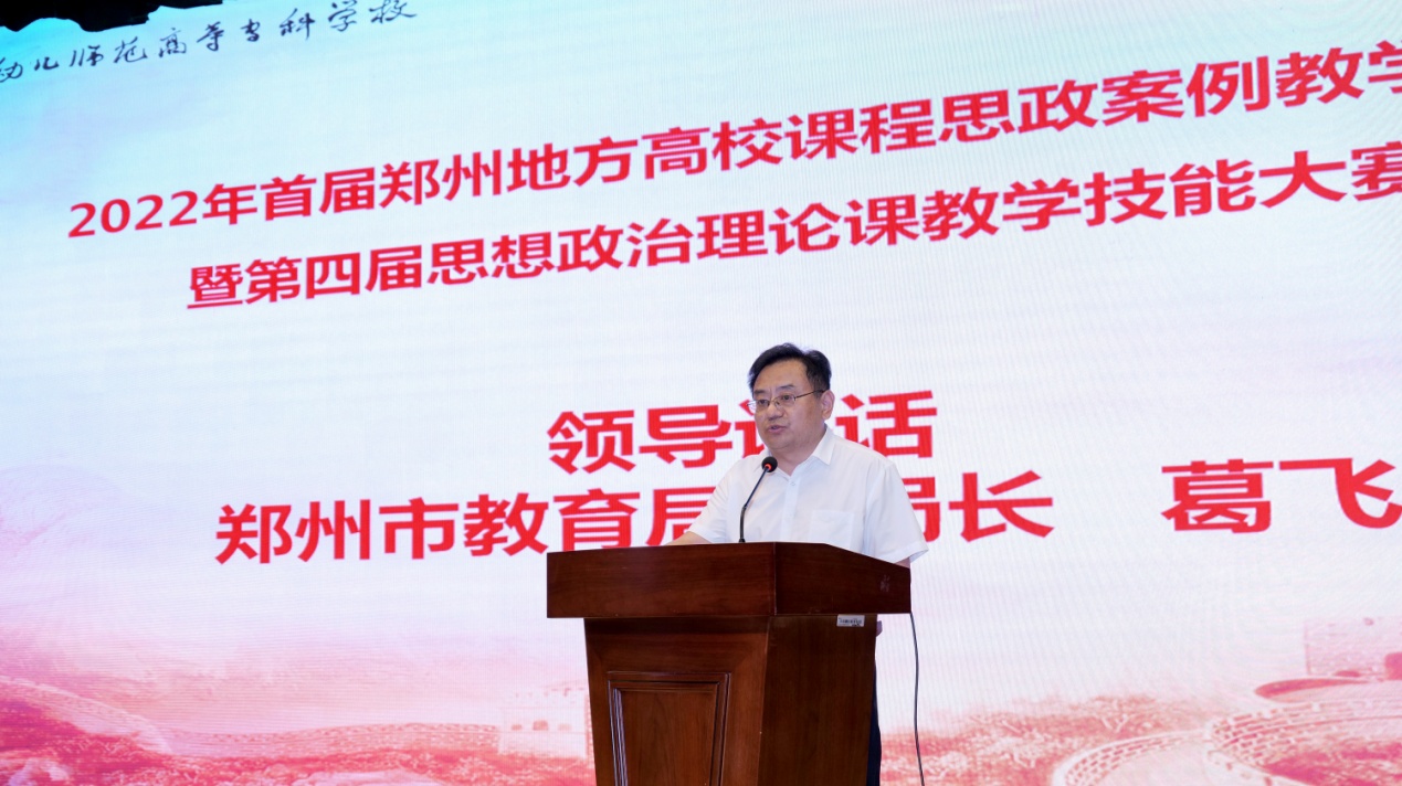 郑州市教育局副局长葛飞同志在讲话中指出,本届思政课教学技能大赛已是第四届。四年来,郑州地方高校思政课教指委按照习近平总书记的要求,积极落实立德树人根本任务,通过教学技能大赛、教改课题研究、研讨交流等一系列卓有成效的活动,大大促进了郑州地方高校思政课教师育人能力的不断提升,教师队伍建设取得突破性进展,青年教师教学改革创新的能力进步明显,得到了省教育厅的充分肯定和高度评价,为郑州地方高校大思政工作格局的构建发挥重要引领作用。广大思政课教师和专业课教师要以本次大赛为契机,充分认识 “思政课程教学”大赛和“课程思政教学”比赛协同育人的重要意义,深入开展教学研究,不断提升育人水平,努力推出更多课程思政“金”课和思政“金”课。