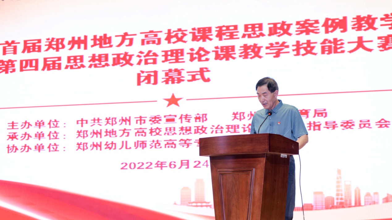 活动最后,中共郑州市委宣传部副部长杨洁强调,本次大赛充分展示了新时代郑州地方高校思想政治理论课和课程思政建设的最新成果,有力推动了思政课程和课程思政同向同行,拓展了思政育人新模式,增强了思政育人的影响力和吸引力。对于如何进一步做好高校思想政治工作,杨洁副部长提出要讲好思政课这一关键课程、要全面推进课程思政建设和要打好日常思政工作组合拳三点意见,强调高校要充分挖掘思政育人元素,打造更多的思政课和课程思政“金”课堂,既发挥思政课立德树人的主渠道作用,又充分挖掘各类课程中蕴含的思想政治教育资源,将其作为专业课教学的兴奋点,既创新载体、积极融入,又入盐入味、咸淡相宜,使门门课程有思政、教师人人讲育人成为专业课教师的思想自觉和行动自觉,扎实推进思政课与课程思政协同育人,积极引导学生将爱国情、强国志、报国行自觉融入实现中华民族伟大复兴的奋斗之中。