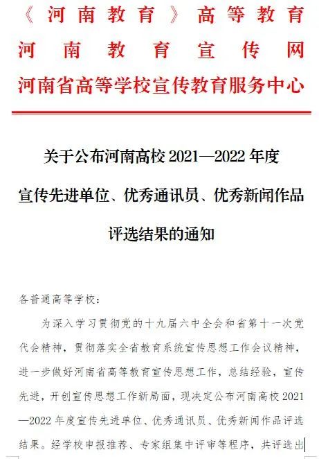 近期 ,河南省教育新闻中心公布河南高校2021-2022年度宣传先进单位、优秀通讯员、优秀新闻作品评选结果。beat365荣获“河南省2020-2021年度宣传先进单位”卓越奖,beat365选送的新闻作品《2021教师节,让我们在共学共勉中坚定教育初心——欢迎收听有声书<习近平总书记教育重要论述>》荣获“河南高校2021-2022年度优秀新闻作品一等奖”(作者:“种子的力”思政工作室),新闻作品《“生机盎然季,沉心觉幸福”心理短视频大赛系列报道》(作者:李琦)荣获“河南高校2021-2022年度优秀新闻作品二等奖”,beat365宣传(统战)部陈自鉴被评为“河南高校2021-2022年度优秀通讯员”。