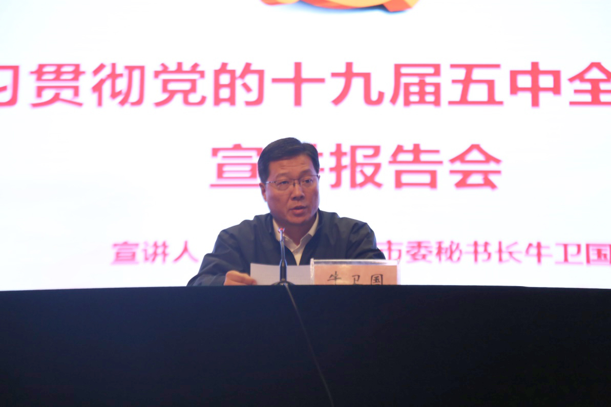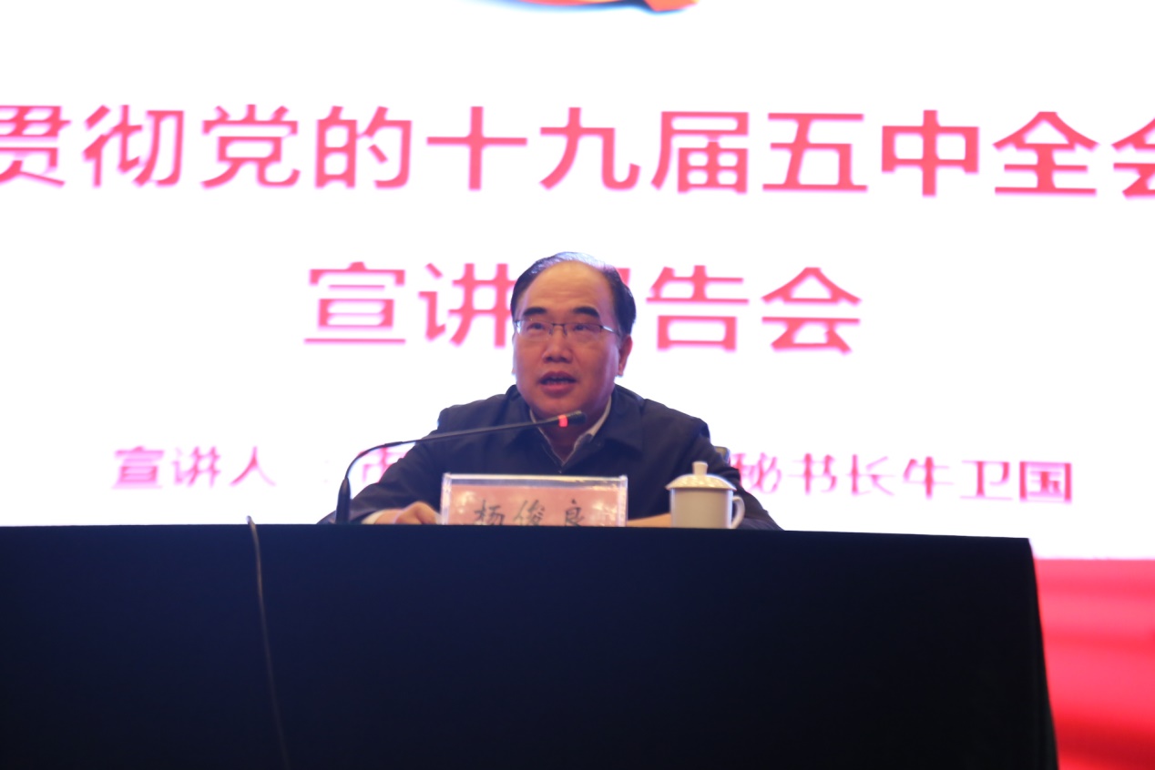 为深入学习贯彻宣传党的十九届五中全会精神,鼓励全体师生不断增强“四个意识”、坚定“四个自信”、做到“两个维护”,切实把思想和行动统一到全会精神和党中央重大决策部署上来,为助力学校升级发展、实现建设教育强国战略目标作出积极贡献。按照市委统一安排,12月24日,郑州市委常委、市委秘书长牛卫国同志莅临beat365进行党的十九届五中全会精神宣讲,与师生们分享交流学习感悟、共话党和人民的殷切期望和新阶段的奋斗目标,勉励师生们在幼儿教育新征程中书写青春华章。校长杨俊良及班子成员、中层干部、支部书记、教师和学生代表聆听了本次宣讲。宣讲会由校长杨俊良主持。