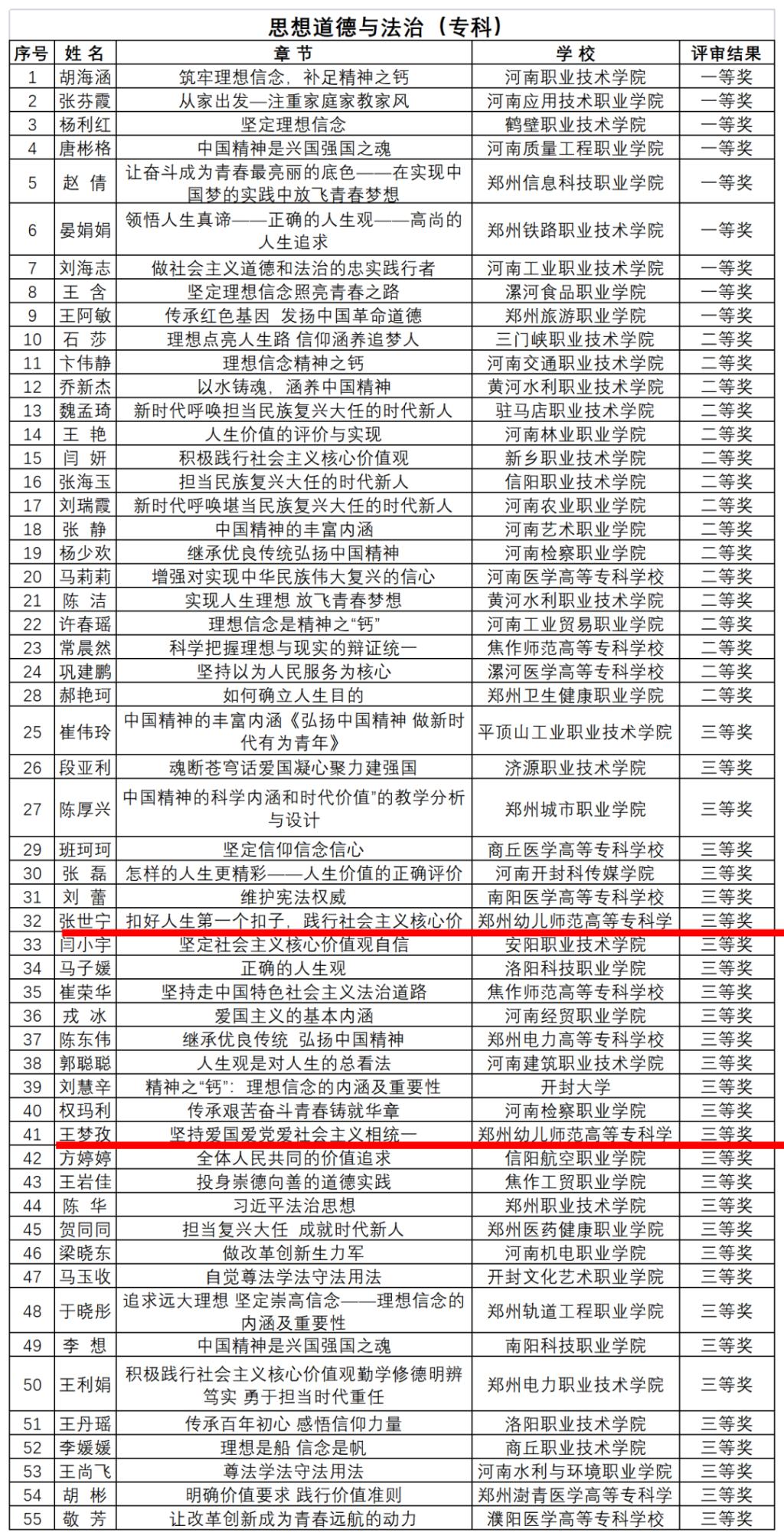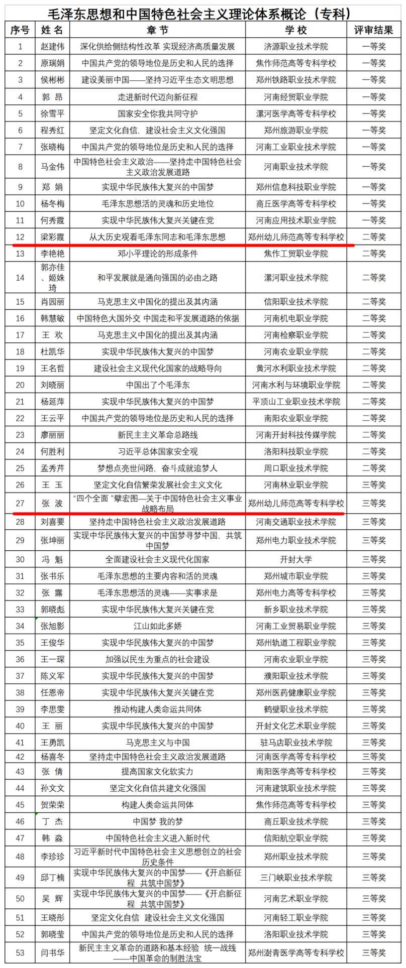 根据中共河南省委教育工委办公室、河南省教育厅办公室《关于开展全省高校思想政治理论课示范“金课”评选活动的通知》要求,经各高校申报、资格审查、专家评审、综合评议等环节。2022年11月30日,河南省教育厅公布了全省高校思想政治理论课示范“金课”的评审结果,我院梁彩霞、张世宁、张波、王梦孜、刘晓丹5名教师分别在《毛泽东思想和中国特色社会主义理论体系概论》课程组、《思想道德与法治》课程组和《形势与政策》课程组示范“金课”评选活动中喜获佳绩。