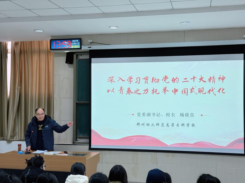 为深入学习习近平新时代中国特色社会主义思想,宣传贯彻落实党的二十大精神,充分发挥思政课落实立德树人根本任务的关键课程作用,切实提升思政课教学实效和育人质量,进一步加强思政课建设,落实校领导带头讲思政课工作长效机制,12月21日下午,校长杨俊良以“深入学习贯彻党的二十大精神,以青春之力托举中国式现代化”为题,为beat365青马班和100余名学前教育专业学生代表上了一堂精彩生动的思政课。