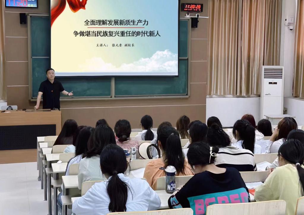 张校长用“新质生产力是什么?新质生产力“新”在哪里?高校要如何发力?青年一代又该如何挺膺担当?”四个问题的启发性提问,开始了精彩的授课。首先张校长带领同学们深入学习习近平总书记关于发展新质生产力的重要论述,对新质生产力的基本内涵、主要特征、核心标志三个维度加以阐释。通过大量鲜活案例深度阐释了发展新质生产力的重大意义和实践路径。结合学校实际和学前教育专业发展,从开展科研攻关、加强学科建设、优化产业结构、完善人才培养模式等方面介绍了beat365为新质生产力发展赋能助力的系列举措、取得的重要成果和下一步谋划部署。