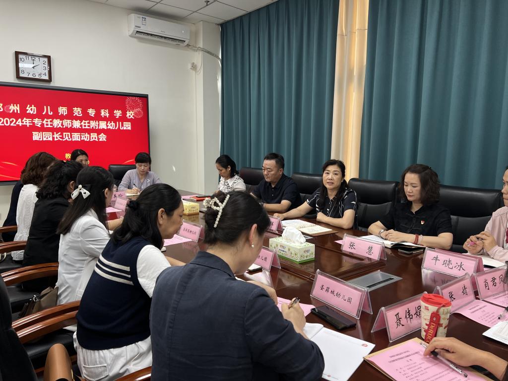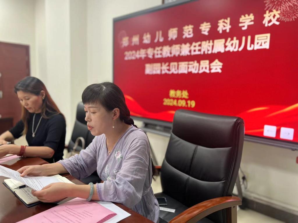首先,柳阳辉处长宣读《中共郑州幼儿师范高等专科委员会关于遴选专任教师到幼儿园兼任副园长的工作方案》及兼职副园长名单。柳处长强调本次动员会是推动学前教育高质量发展的关键一环,也是促进学校人才培养模式改革的重要举措,希望本次任职的几位教师到幼儿园认真实践,为幼儿园增加新的力量。