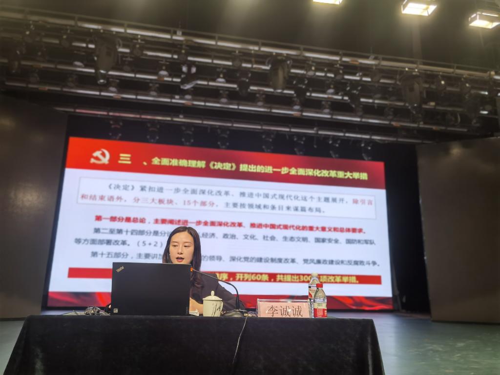 宣讲中,李老师用生动的案例、丰富详实的数据,带领我们从党的二十届三中全会的重大时代意义和深远历史影响、深入学习领会习近平总书记在党的二十届三中全会上的重要讲话精神、全面准确理解《决定》提出的进一步全面深化改革重大举措、以实际行动贯彻落实党的二十届三中全会精神四个方面对党的二十届三中全会精神进行了全面解读和深入阐释,报告主题鲜明,结合教育工作实际,具有很强的理论性和现实指导性。