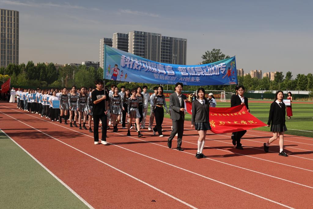 开幕式现场彩旗飘扬,气氛热烈。学校党委书记王志军、校长马宏霞、副校长杨龙、副校长张元奎、校纪委书记王红梅、副校长王亚斌等领导出席,各相关处室、学院负责人共同见证这场春日体育盛会。伴随着激昂的运动员进行曲,八大学院代表队踏着整齐的步伐依次入场。他们洋溢着青春朝气,手持创意道具,通过特色方阵展现专业魅力与青春活力,赢得了全场阵阵掌声与喝彩。