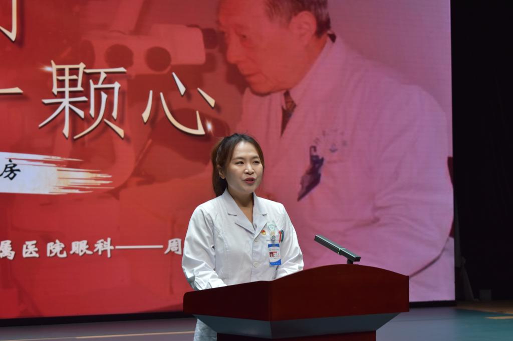 活动现场,郑州大学第一附属医院眼科医生周晶倾情讲述第九届全国道德模范张效房的先进事迹,结合珍贵影像资料,生动展现张效房教授从医86年来,年逾百岁仍心系患者、坚守临床与教学一线、无私奉献的崇高医德,深刻诠释“生命不息、奋斗不止”的职业信仰与责任担当,引发在场师生强烈共鸣。