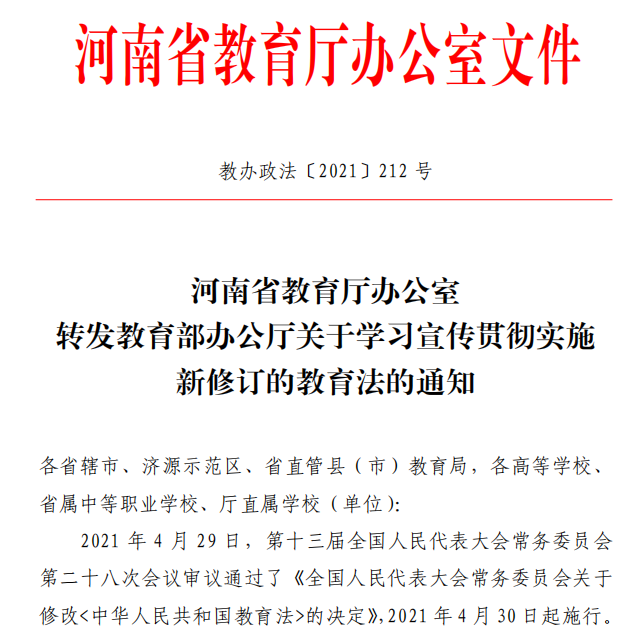2021 年 4 月 29 日,第十三届全国人民代表大会常务委员会第二十八次会议审议通过了《全国人民代表大会常务委员会关于修改<中华人民共和国教育法>的决定》,2021 年 4 月 30 日起施行。现将《教育部办公厅关于学习宣传贯彻实施新修订的教育法的通知》(教政法厅函〔2021〕12 号)转发给你们,并结合我省实际, 就学习宣传实施工作,提出如下意见,请一并贯彻落实。