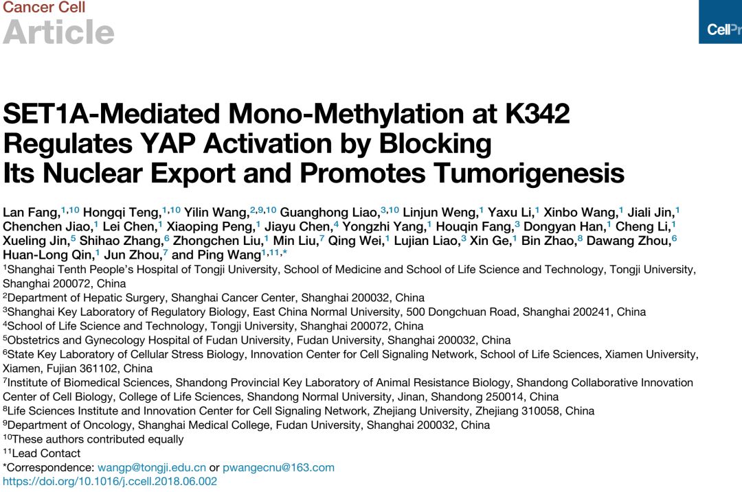 beat365在线唯一官网王平教授长期研究肿瘤微环境对关键信号通路蛋白翻译后修饰的调节分子机制,对TOR、NFkB等通路的调节机制提出了新见解。6月29日最新一期Cancer Cell杂志在线发表了王平教授团队题为SET1A-mediated mono-methylation at K342 regulates YAP activation by blocking its nuclear export and promotes tumorigenesis的研究论文,从蛋白质翻译后修饰的角度阐明了Hippo通路调控的新机制及其在肿瘤发生发展中的作用。