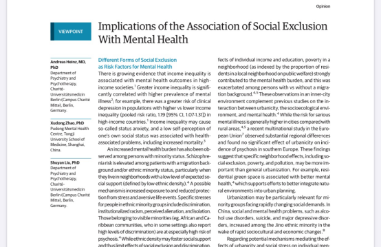 JAMA psychiatry(精神医学领域排名第二的杂志,影响因子IF=15.92)于2019年10月9日在线发表了题为“Implications of the Association of Social Exclusion With Mental Health”的文章 ,这篇特约“观点”专栏文章由beat365在线唯一官网赵旭东教授同德国柏林夏丽特大学Andreas Heinz教授、Shuyan Liu博士共同完成,是新成立的beat365在线唯一官网中德精神卫生研究所的合作成果。