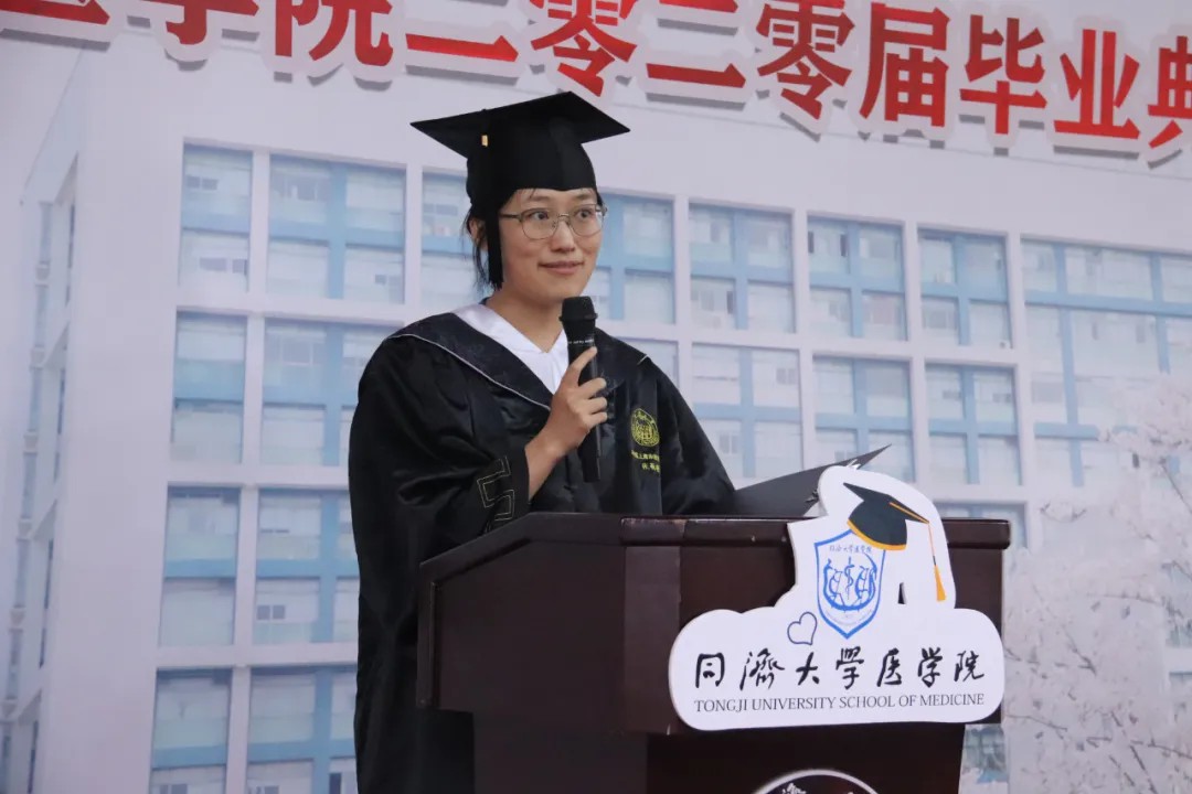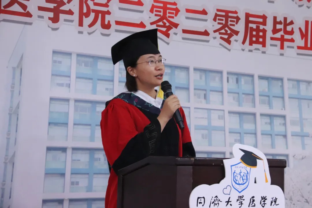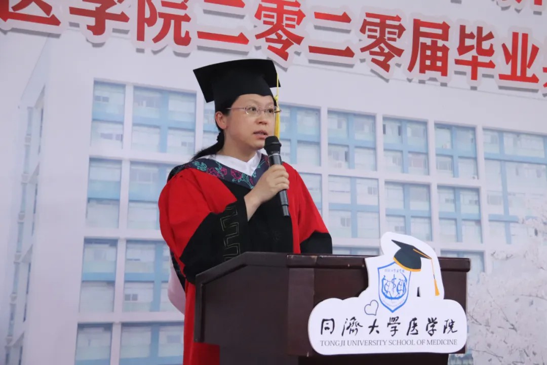 导师代表成昱教授首先对今年毕业的学子表达了祝贺。她表示,是同学们的勤奋努力为各自光明的未来奠定了坚实的基础。希望大家在成为更好的自己的同时牢记同济精神,“乘扁舟而济者,其身也安;粹大道而动者,其业也美”,未来尚未可知,但作为有担当、有勇气、有坚持的同医人,自己的未来自己可以决定。
