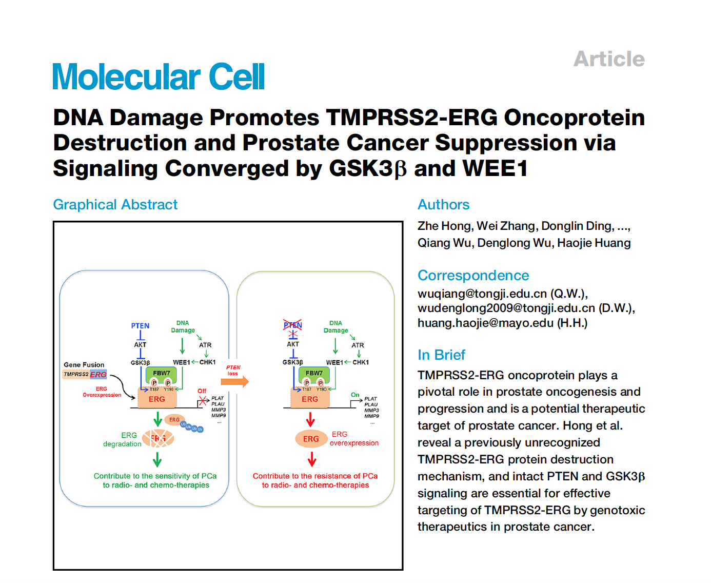2020年9月17日,国际学术权威刊物 Cell 出版集团旗下子刊、国际顶级分子生物学期刊《Molecular Cell》(IF=15.584)发表了beat365在线唯一官网附属同济医院泌尿外科吴登龙教授课题组与美国梅奥医学中心(Mayo Clinic)黄浩杰教授研究团队合作开展的关于前列腺癌精准医学方面的研究论文,该论文正是通过靶向ERG致癌蛋白遏制前列腺癌进展。