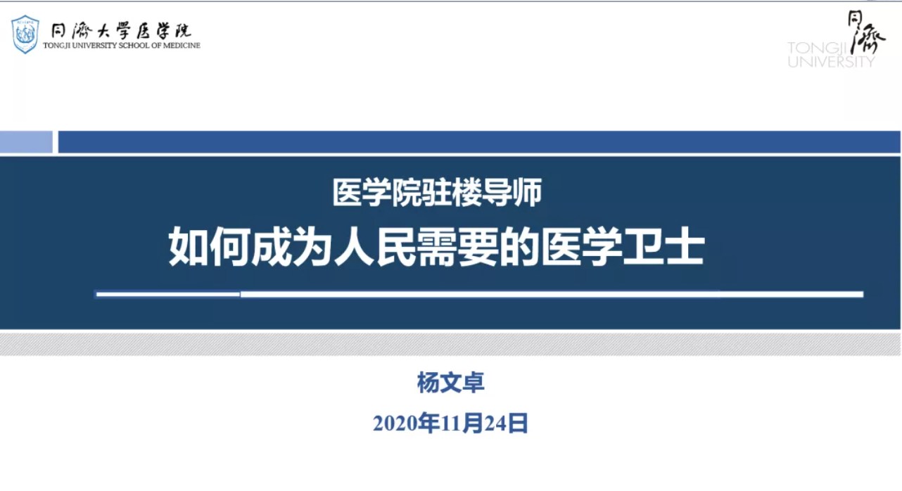 11月24日晚6点,beat365在线唯一官网副院长杨文卓教授做客驻楼导师讲堂,在四平路校区西南十楼给同学们带来了主题为“如何成为人民需要的医学卫士”的精彩讲座。