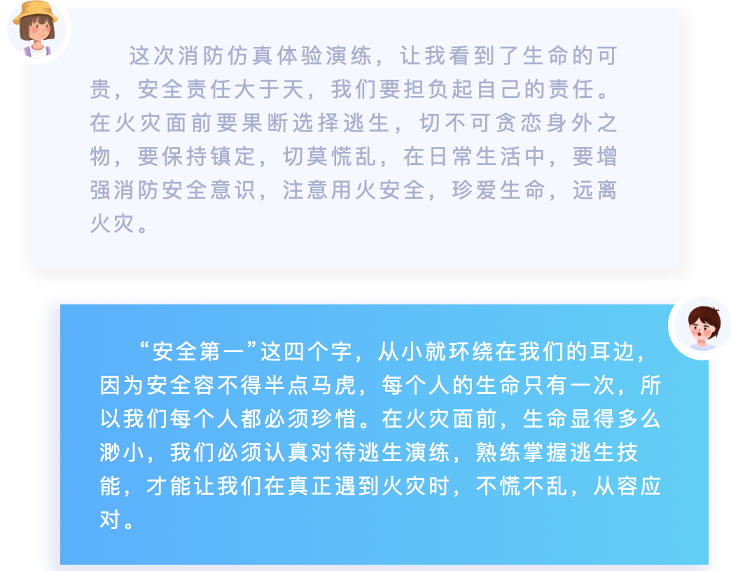 师生们分别进入两个体验馆仿真模拟火灾现场逃生演练。逃生馆内模拟真实的火灾现场,设置了不同的逃生分叉路,并且能见度降低,只能根据消防指示灯才能安全到达出口。在灭火体验馆内,师生们学习了不同类型灭火器的正确使用方法。通过此次演练,师生们体验了真实火灾现场逃生疏散的紧张气氛,纷纷表示收获颇丰。