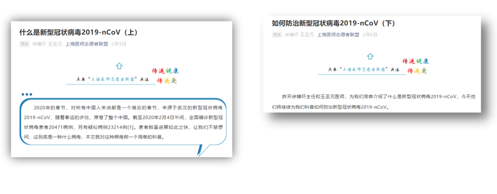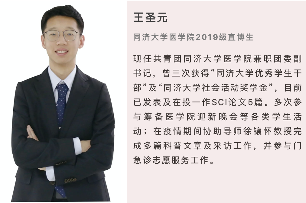作为一名呼吸内科的学生,在疫情期间王圣元也做出了力所能及的贡献。疫情初始,在导师的带领下完成了上海医师志愿者联盟的两篇有关新型冠状病毒的科普文章;同时也为一线抗疫人员答疑解惑,并协助制作宣传海报。全国复产复工之际,协助导师完成了点击量达24.4万的“新冠肺炎疫情下的安全复工手册”;复学之际,协助导师完成了采访文章“返校前哨站丨徐医生返校防护十一问”,为同济学子复学过程中可能遇到的问题及如何做好自我防护提出建议。