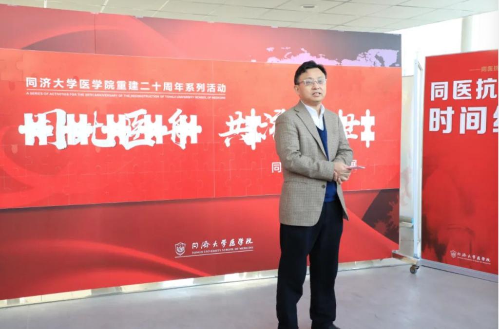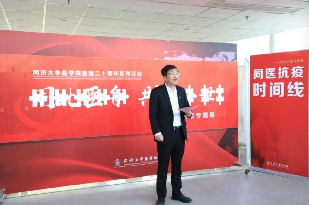 张军书记向嘉宾和观众介绍了展览的初衷和内容。同医人助力疫情防控,医护人员以生命守护生命,科研人员将论文写在抗击疫情第一线,学子在前辈激烈下以知促行,学院在学校领导下力行守护师生身心健康。同医人将以这种共克时艰的精神,助推同济医学发展和健康中国建设。