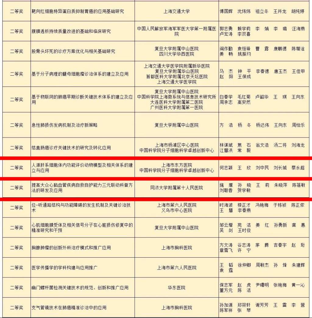 我校附属杨浦医院林谋斌教授牵头完成的项目“结直肠癌诊疗关键技术的研究及转化应用”、附属东方医院刘中民教授牵头完成的项目“人源肝系细胞体内功能评价动物模型及相关体系的建立与应用”、附属第十人民医院施雁教授团队独立完成的项目“提高大众心脑血管疾病自救自护能力三元联动科普方法的研发及应用”,分别荣获2020年度上海医学科技奖二等奖。