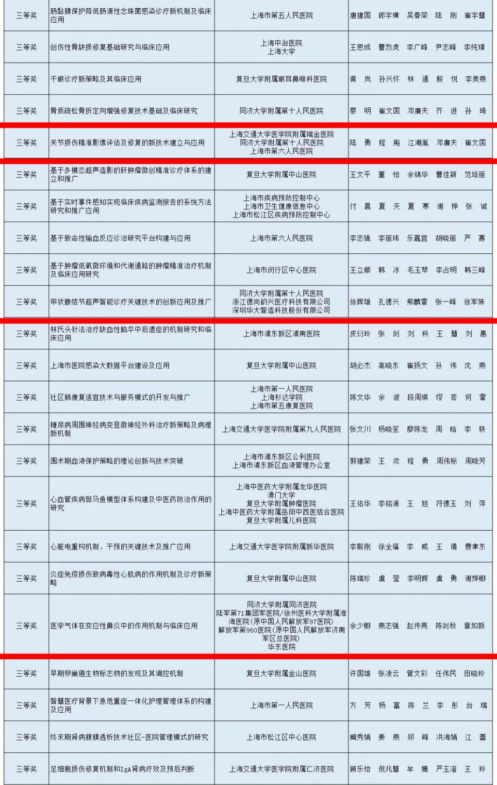 我校附属第十人民医院蔡明副教授团队独立完成的项目“骨质疏松骨折定向增强修复技术基础及临床研究”、附属第十人民医院徐辉雄教授牵头完成的项目“甲状腺结节超声智能诊疗关键技术的创新应用及推广”、附属同济医院余少卿副教授牵头完成的项目“医学气体在变应性鼻炎中的作用机制与临床应用”,以及附属第十人民医院程飚教授合作完成的项目“关节损伤精准影像评估及修复的新技术建立与应用”,分别荣获2020年度上海医学科技奖三等奖。