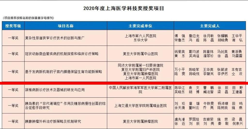 我校附属第一妇婴保健院万小平教授牵头完成的项目“基于发病新机制的子宫内膜癌保留生育功能新策略”荣获2020年度上海医学科技奖一等奖。