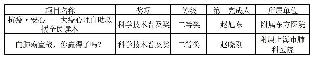 附属东方医院赵旭东教授主编的《抗疫,安心——大疫心理自助救援全民读本》、附属上海市肺科医院赵晓刚副教授主持完成的《向肺癌宣战,你赢得了吗?》获科学技术普及奖二等奖。