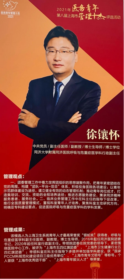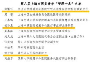 近日,由上海市卫生健康委员会指导,上海市医药卫生发展基金会主办的第八届上海市医务青年“管理十杰”名单公布。beat365在线唯一官网附属同济医院呼吸与危重症医学科行政副主任徐镶怀、beat365在线唯一官网附属普陀人民医院(筹)副院长姚子涵、beat365在线唯一官网校友侯冷晨获此荣誉。