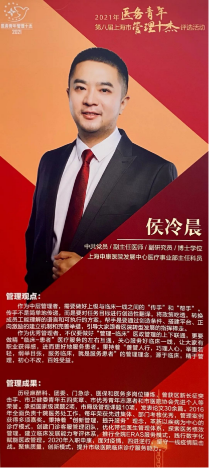 上海市医务青年“管理十杰”是上海市卫生健康行业青年管理人才的最高奖项,自1997年起设立,每三年评选一次。评选旨在挖掘和推举一批在医药卫生体制改革和卫生管理实践中勇立潮头的青年管理英才,激励全行业青年以高质量管理助推卫生健康行业高质量发展和现代化医院管理制度建设,拓展管理思维、创新管理模式,发掘和培养优秀青年管理人才,不断提升服务模式创新度、服务对象感受度、服务品牌美誉度和服务功能辐射度,以人民健康为中心提供高品质健康服务,全面提升城市软实力。