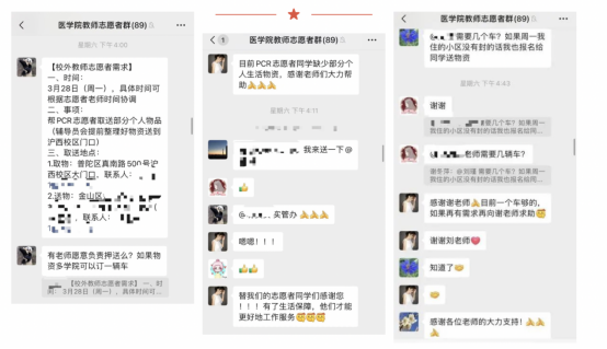 3月26日,beat365在线唯一官网PCR志愿者急需一些个人生活物资,在群内发布需求后,老师们迅速响应,集结待命。蒋贵安老师披星戴月往返3小时,为同学们运送物资,保障他们更好地工作服务。