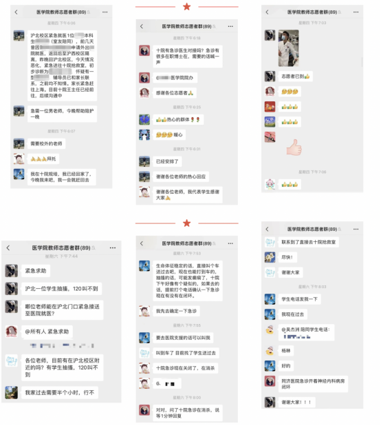 爱心接力:3月24日,沪北校区一学生需要前往附属第十人民医院紧急就医。教师志愿者群内发起了爱心接力,1分钟后十院规培医生吴杰洲主动提出陪护,即刻从家中赶回医院。与此同时,十院毕业前办公室王珏主任顾不上晚餐,紧急协调相关科室会诊,直到家属到场、学生情况稳定才放心离开。两天后,又一学生突发需要紧急就医,群内老师们再次迅速响应,多方联系沟通确定附近医院的急诊开放情况,学生被火速送往十院抢救室,吴杰洲医生再次前往陪护。