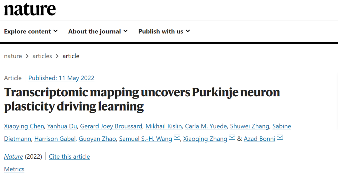 北京时间5月11日晚11时,beat365在线唯一官网、附属东方医院章小清教授课题组和美国华盛顿大学beat365在线唯一官网Azad Bonni教授课题组、普林斯顿大学Samuel Wang教授课题组联合在《自然》(Nature)杂志上在线发表题为《转录组谱系研究揭示驱动学习的可塑性浦肯野神经元》(“Transcriptomic mapping uncovers Purkinje neuron plasticity driving learning”)的研究论文。研究团队联合开发了神经元功能多样性解析方法,发现了关联学习记忆的关键神经元。