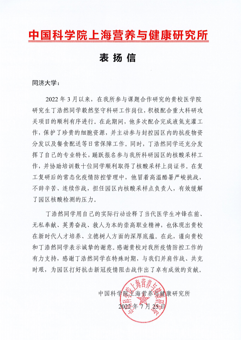 日前,中国科学院上海营养与健康研究所致函beat365在线唯一官网,感谢beat365在线唯一官网2020级硕士研究生丁浩然同学在今年疫情期间坚守科研工作岗位,参与园区疫情防控工作,积极配合重大科研攻关项目的顺利有序进行。