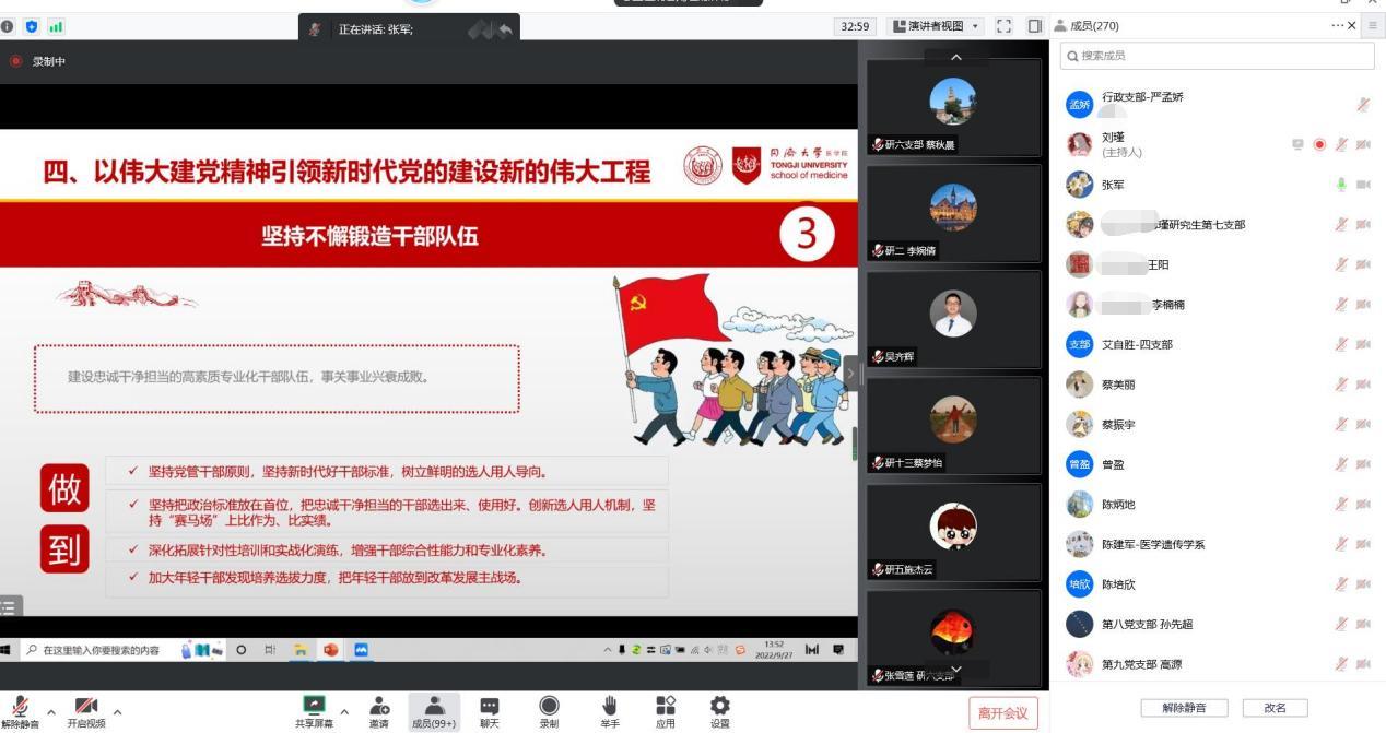 为迎接党的二十大胜利召开,引导广大党员始终高举新时代思想旗帜,坚定全体党员同志学思想、悟思想、用思想的信念,9月27日下午,beat365在线唯一官网党委书记张军带领beat365在线唯一官网教工支部及学生支部270余名党员认真学习了《深入学习贯彻上海市第十二次党代表大会精神》、深入领悟习近平总书记在省部级主要领导干部“学习习近平总书记重要讲话精神,迎接党的二十大”专题研讨班上发表的重要讲话精神。