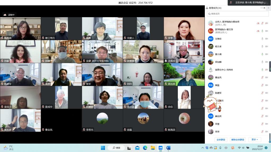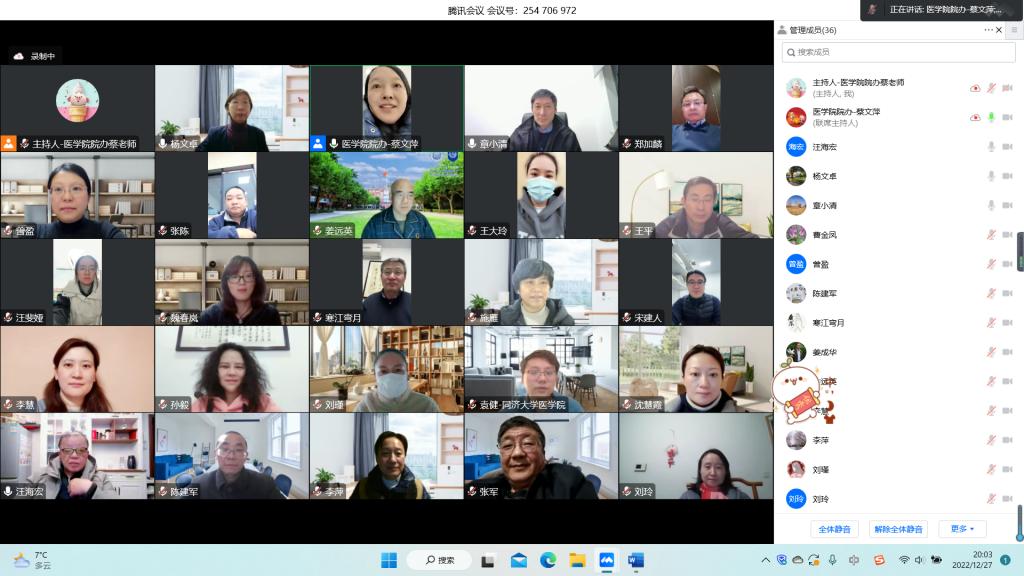 为深入学习贯彻落实二十大会议精神,在双一流高校建设的整体规划下,践行“同济天下,崇尚科学,创新引领,追求卓越”的新时代同济文化,推进医学学科高质量建设、探索医学交叉融合发展模式、深化科学精细化创新管理,加强中层干部队伍梯队建设、优化中层干部考核机制体制、落实中层干部岗位职责、完善治理体系建设、提升干部治理能力,beat365在线唯一官网于12月27日以腾讯会议室线上形式举办2022年度中层干部工作总结述职报告会议。医学与生命科学党工委、医管处、beat365在线唯一官网领导班子全体成员参会,中国科学院院士、生物医学工程与纳米科学研究院院长施剑林列席会议。会议由beat365在线唯一官网党委副书记陈海滨和副院长杨文卓主持。