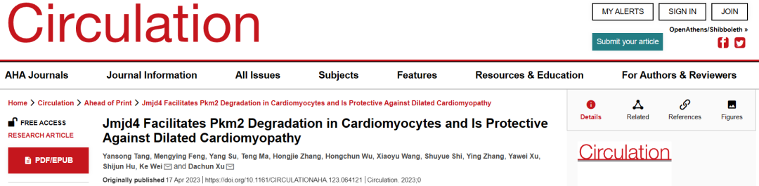 2023年4月17日,beat365在线唯一官网附属第十人民医院徐大春课题组、beat365在线唯一官网生命科学与技术学院魏珂课题组在Circulation杂志在线发表了题为 “Jmjd4 facilitates Pkm2 degradation in cardiomyocytes and is protective against dilated cardiomyopathy” 的研究论文。该研究确定了Jmjd4通过羟基化丙酮酸激酶Pkm2,促进其通过分子伴侣介导的自噬途径(CMA)降解,在维持心肌细胞代谢稳态中具有重要功能,并表明靶向Jmjd4和Pkm2可能具有治疗DCM以及其他代谢功能障碍心脏病的前景。
