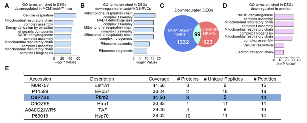 为了进一步研究Jmjd4诱发扩心病的机制, 研究者对Jmjd4条件性敲除小鼠的心肌组织和体外敲减Jmjd4的心肌细胞进行了全转录组测序(RNA-seq),结果发现体内、体外敲减Jmjd4后的差异基因均主要富集在线粒体代谢相关的通路上。随后研究者通过免疫共沉淀联合质谱技术鉴定了心肌细胞中与Jmjd4相互作用的蛋白,并结合Jmjd4敲除后代谢物的质谱分析,确定了Jmjd4的下游蛋白丙酮酸激酶Pkm2(图2)。